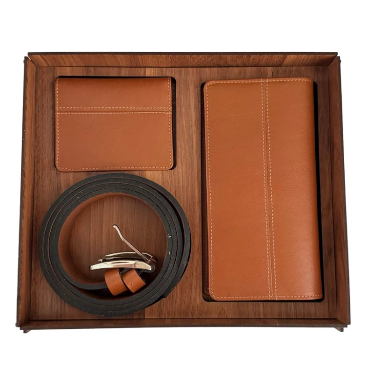 متاسفانه این کالا در حال حاضر موجود نیست. میتوانید از طریق لیست بالای صفحه، از محصولات مشابه این کالا دیدن نمایید.ست کیف و کمربند چرم یک ست 3تکه می باشد که از یک کیف پول پالتویی یا بلند، یک جاکارتی، یک تسمه و یک سگک کمربند تشکیل شده است که در یک جعبه چوبی بسیار شیک قرار گرفته اند. تمامی محصولات این ست از چرم طبیعی تهیه شده و تولید آنها در نهایت ظرافت و دقت انجام شده است. این ست در سه رنگ مشکی، قهوه ای تیره و عسلی موجود می باشد. یک ست هدیه کیف و کمربند چرم بعنوان کادو برای مرد ها در هر سن و سال و موقعیت اجتماعی که باشند و با هر نوع سلیقه و سبک زندگی که داشته باشند یک هدیه چشمگیر و کاربردی خواهد بود. کیف پول پالتویی این ست، برای هر چه که انتظار می رود در یک کیف پول بتوان نگهداری کرد جای مناسب تعبیه شده است و براحتی می توانید پول و کارتها و مدارک مختلف خود را در آن نگهداری نمایید.